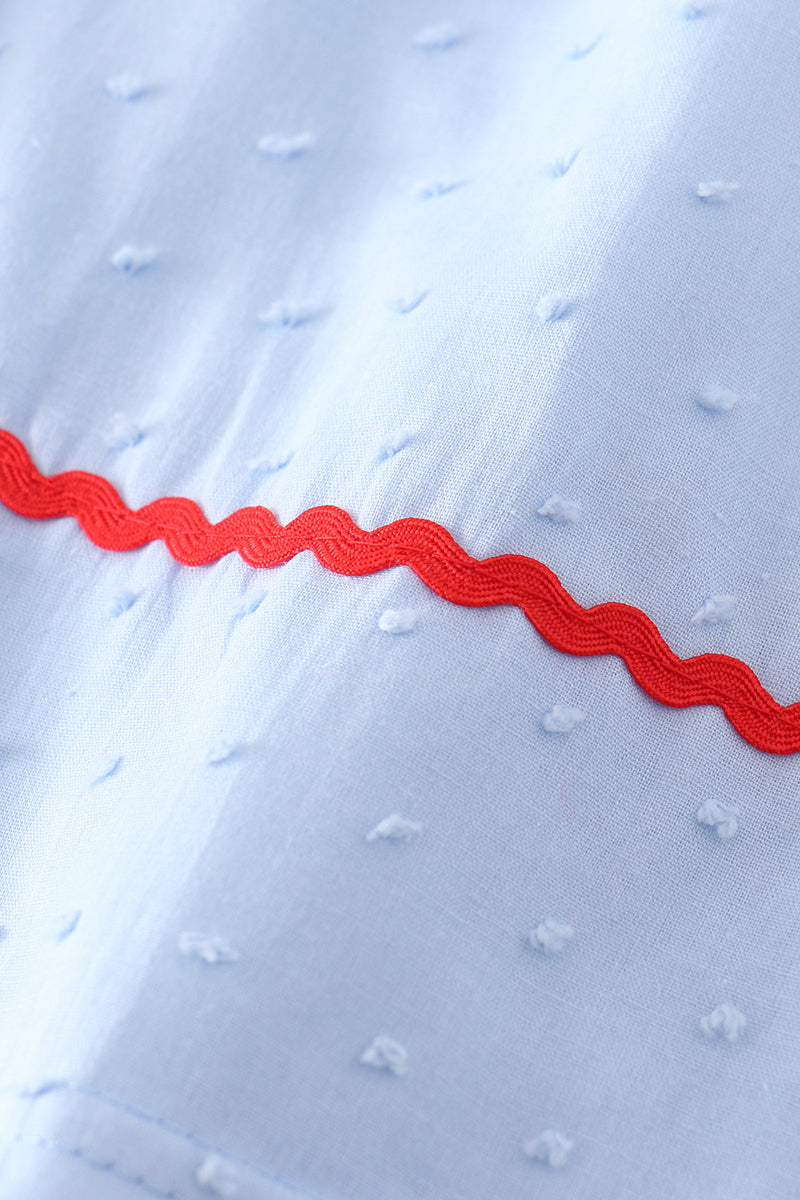 Show off your playful patriotism with our Blue Swiss Dot Flag Embroidery Dress. Perfect for any summer event, this dress features a charming flag embroidery detail. Feel confident and stylish while celebrating in this unique and quirky dress. (35 words)