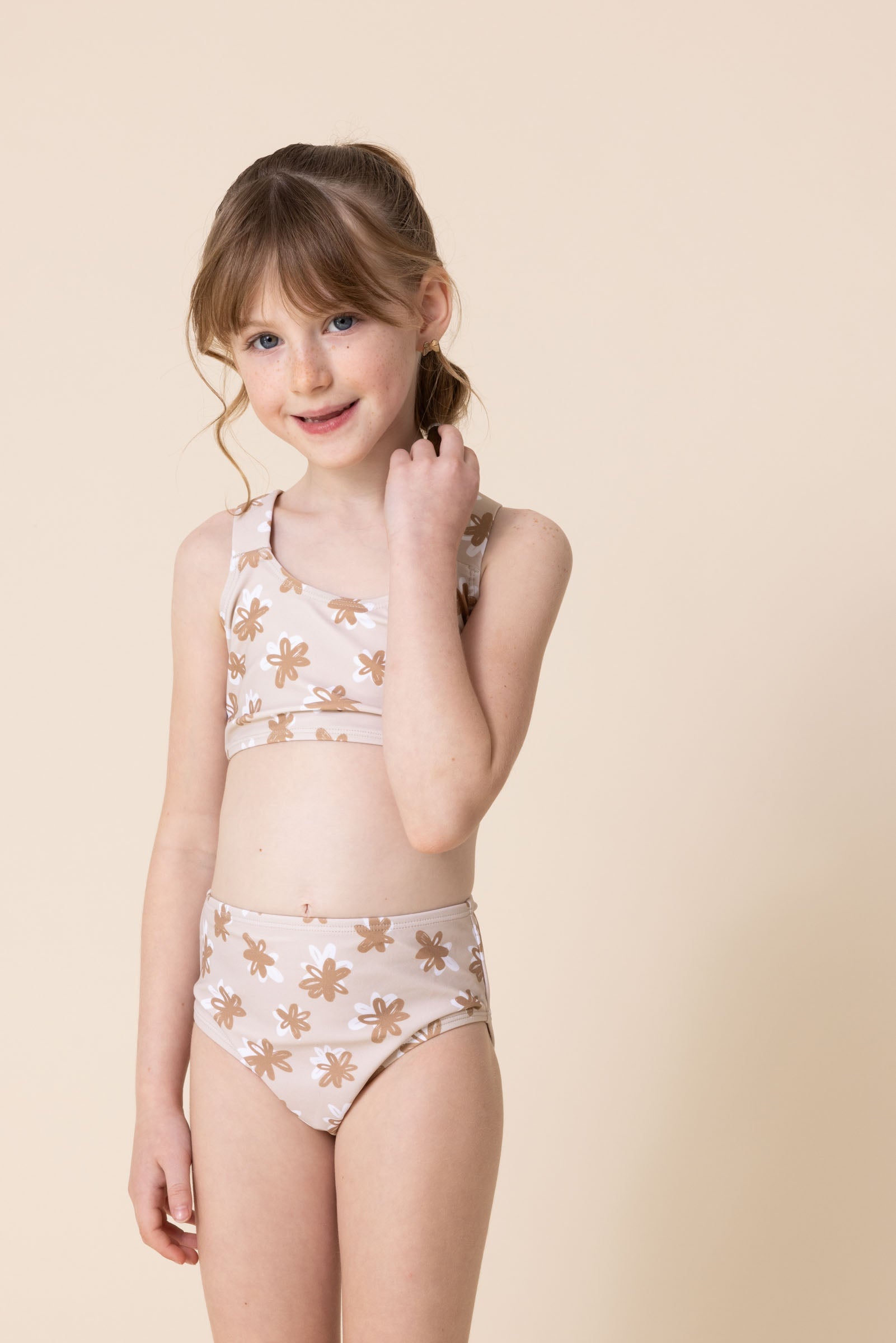 Brown & white floral print 2pc girl swimsuit (size run small, go up 2-3 sizes)