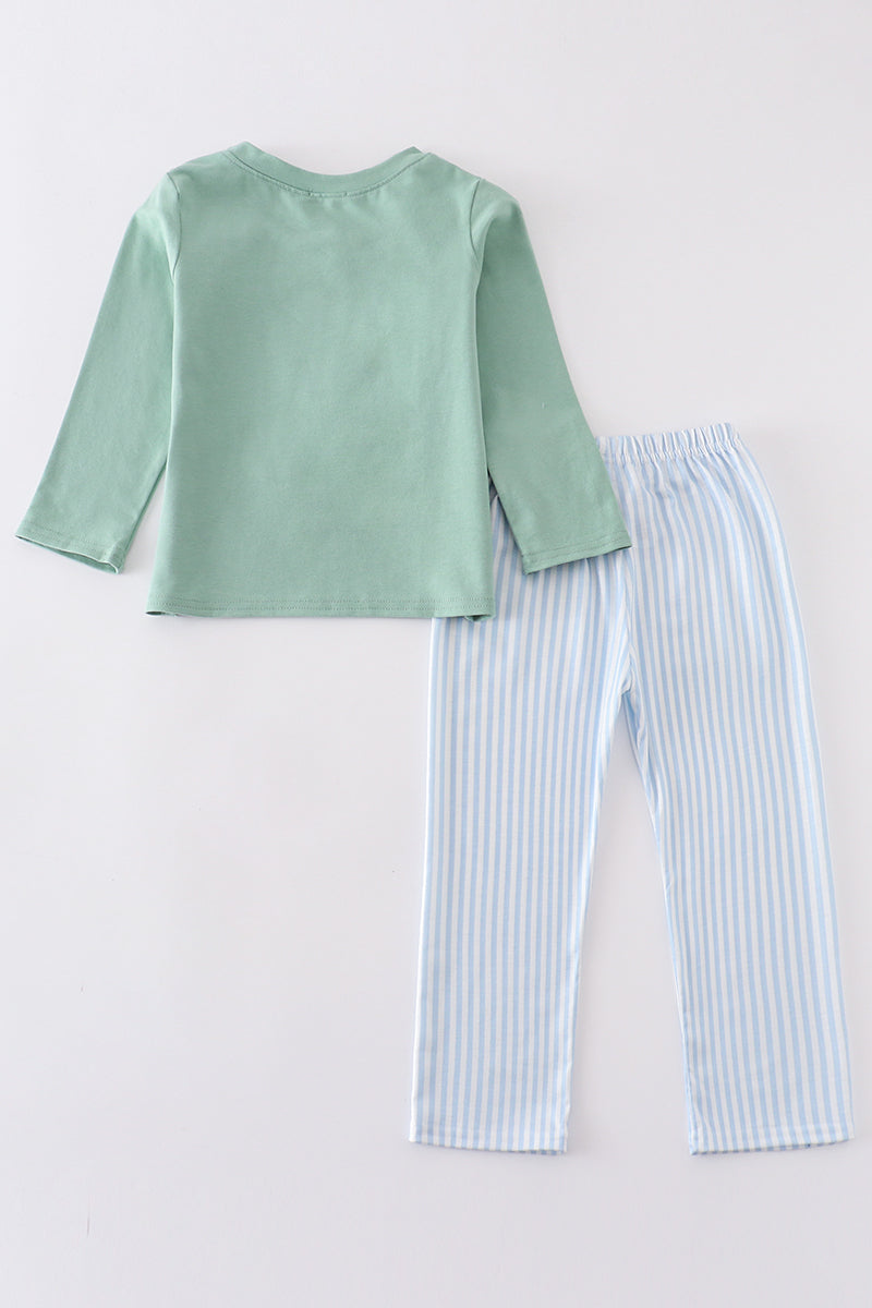 Get ready for puppy love with this adorable Green Valentine boy set! The playful embroidery of a puppy holding a heart on a green background adds a fun and quirky touch to this set. Perfect for celebrating Valentine's Day or any day filled with love.