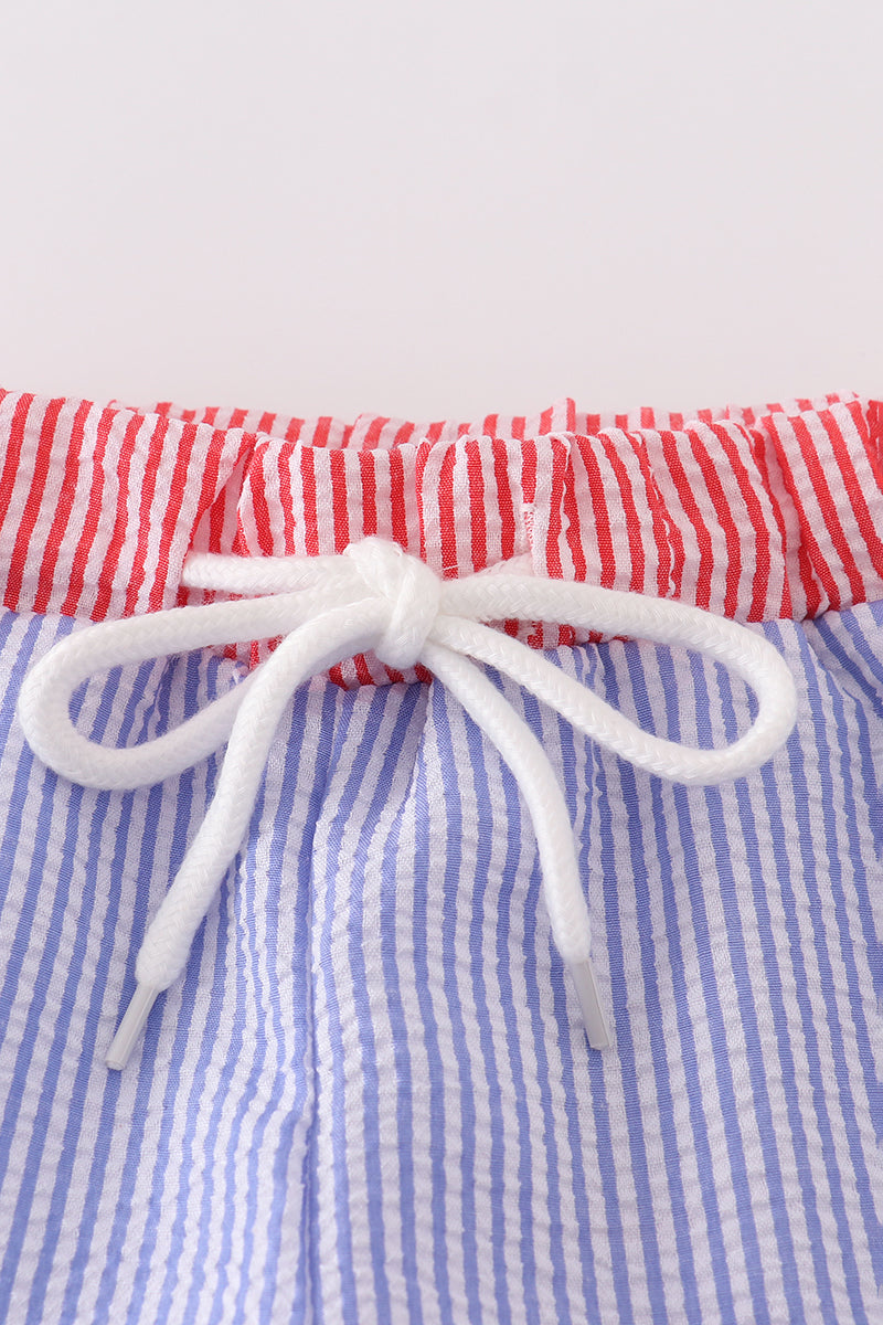 Make a splash with these charming navy seersucker swim trunks for boys, featuring an embroidered Atlanta Braves logo. Perfect for summer days at the pool or beach. Batter up!