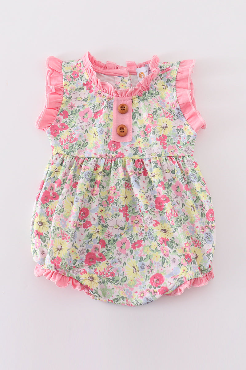 Let your little one bloom in style with our Pink Floral Ruffle Bubble! This adorable outfit features a playful pink floral print and charming ruffles, perfect for a day filled with fun and fashion. She'll be the cutest flower in the garden!