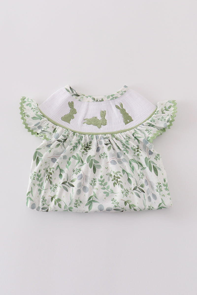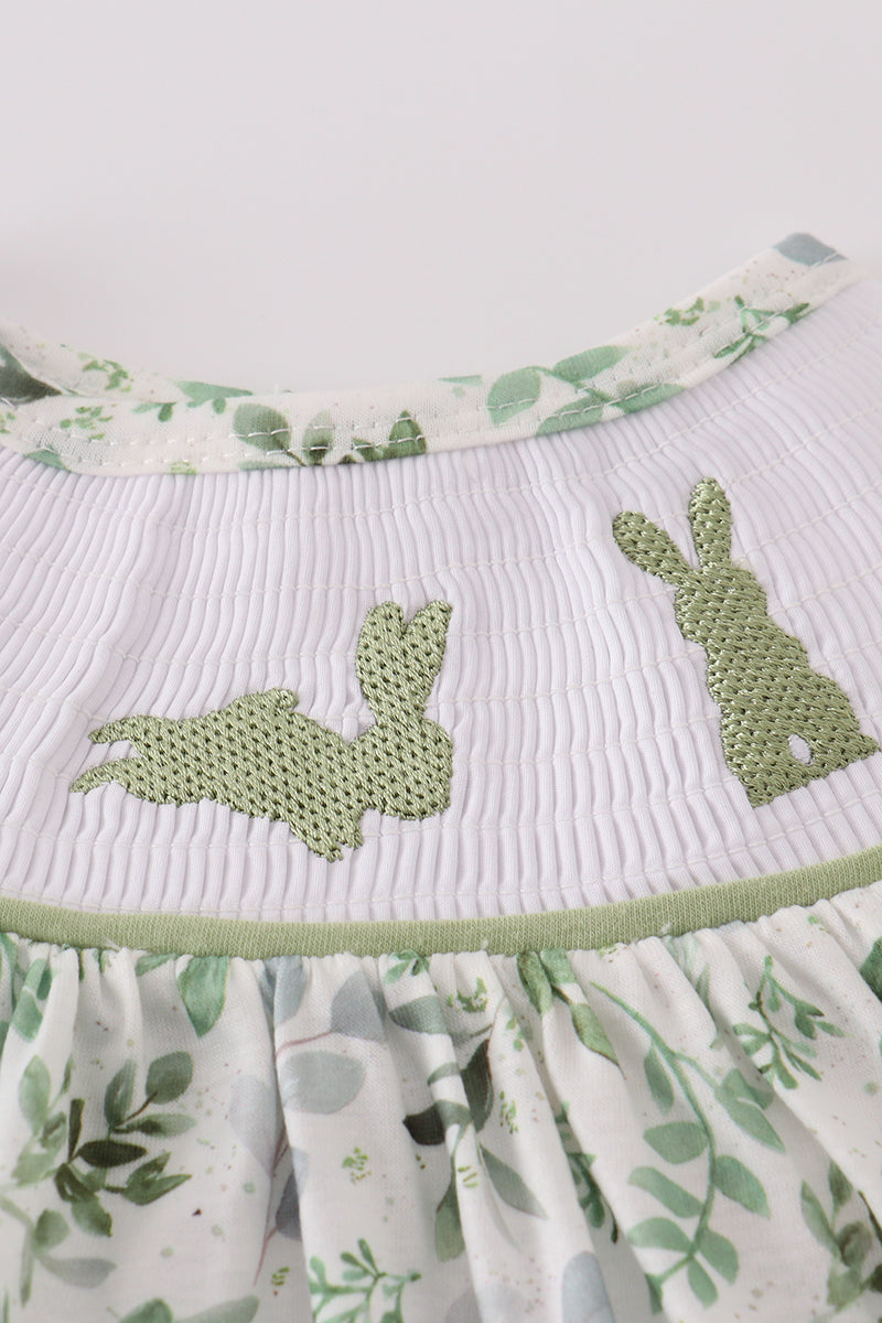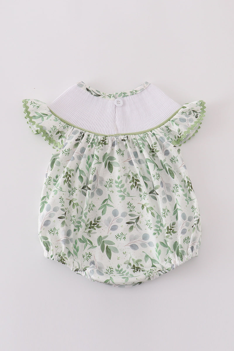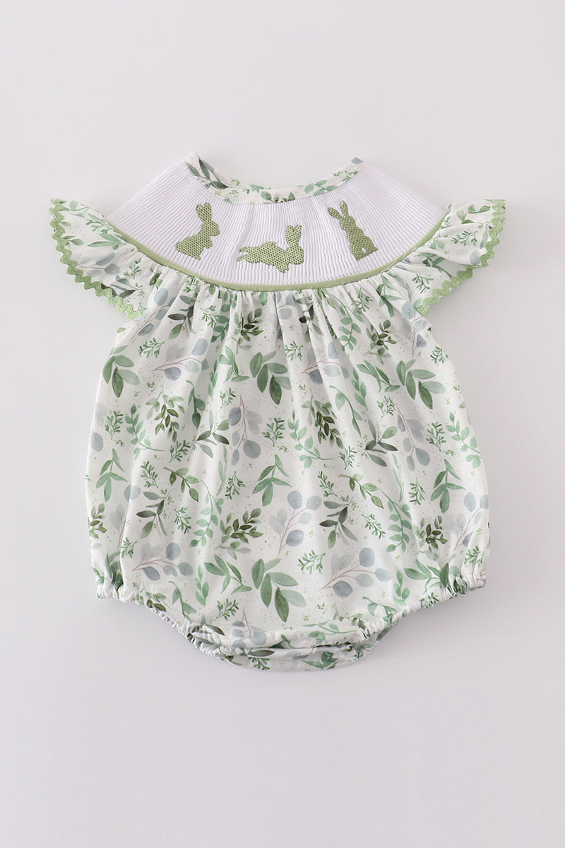 Hop into style with our sage leaf bunny embroidery smocked bubble! This adorable outfit features a playful bunny design and comfortable smocked detailing. Perfect for any little one with a sense of humor (or their parents), this bubble is sure to bring a smile to your face!