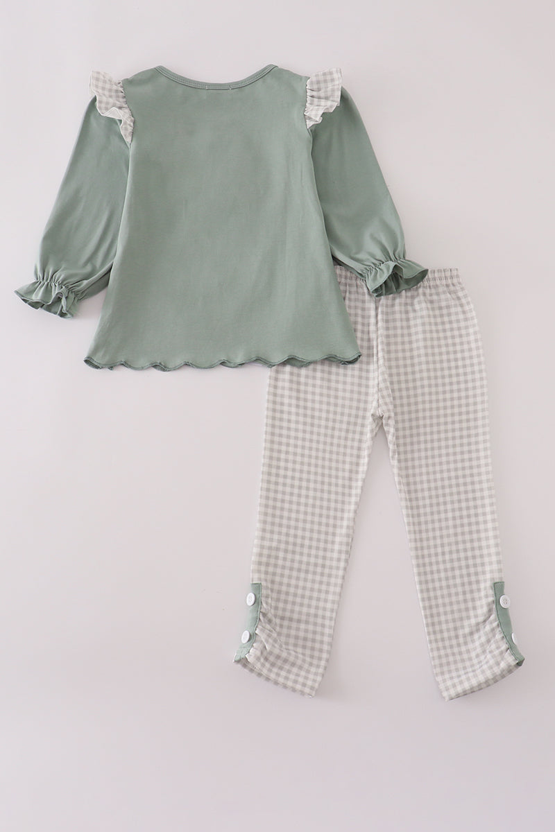 Add a touch of whimsy to your little one’s wardrobe with the Sage Turkey French Knot Ruffle Pants Set. Featuring charming ruffle details and a soft sage hue, this playful outfit combines comfort and style for everyday adventures. Perfect for twirling, exploring, and making memories in cozy, cute fashion.